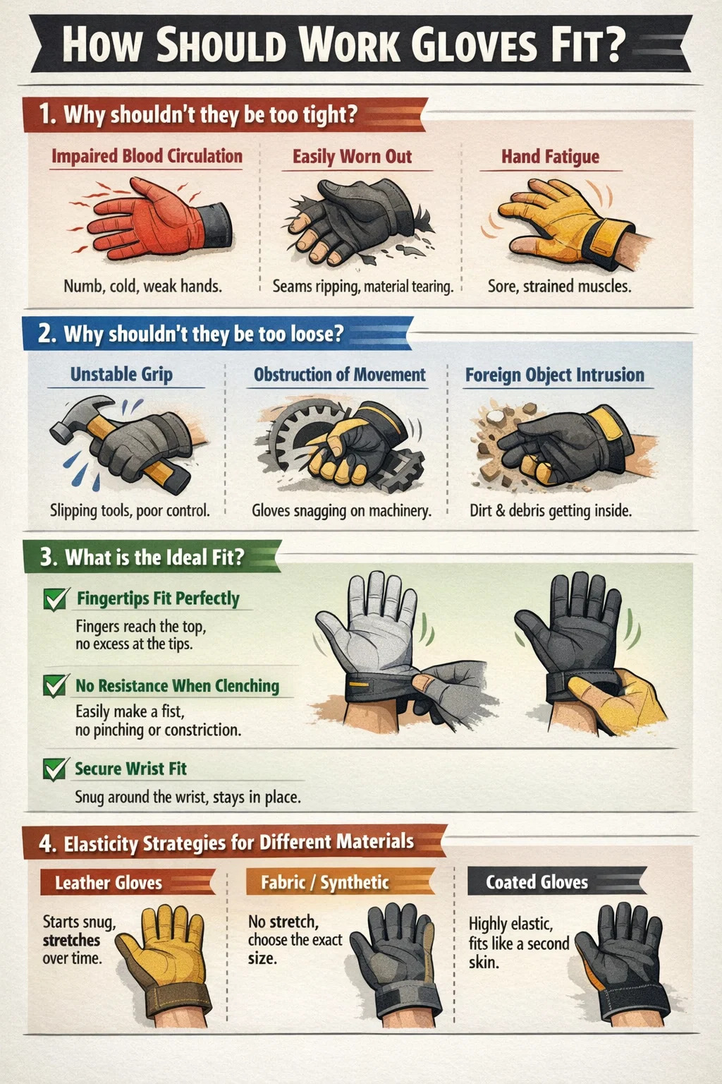 Jika sarung tangan terlalu ketat, tangan akan mati rasa, dingin, bahkan terasa lemas setelah dipakai dalam waktu lama sehingga membuat pekerjaan menjadi tidak aman.