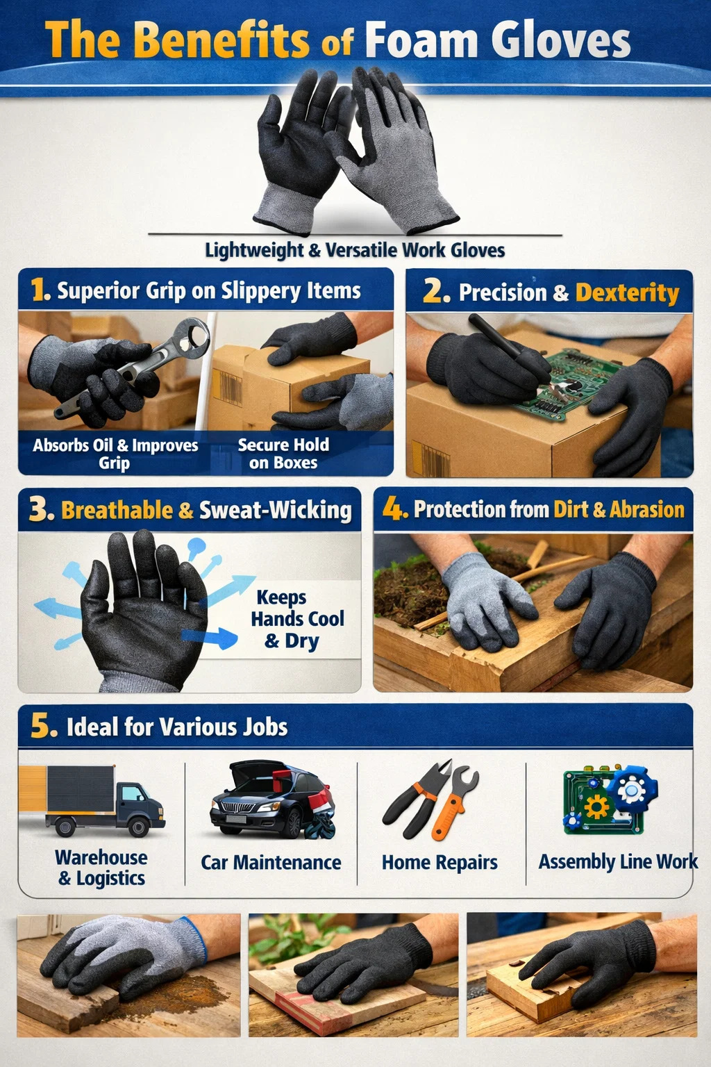 Bernapas dan Menyerap Keringat: Karena disebut "berbusa", lapisannya bukanlah balok padat. Udara dapat melewati pori-pori kecil yang tidak terlihat dengan mata telanjang, membuatnya lebih mudah bernapas dibandingkan sarung tangan karet murni. Setelah seharian bekerja, telapak tangan Anda tidak akan benar-benar kering, namun setidaknya tidak terasa lengket.