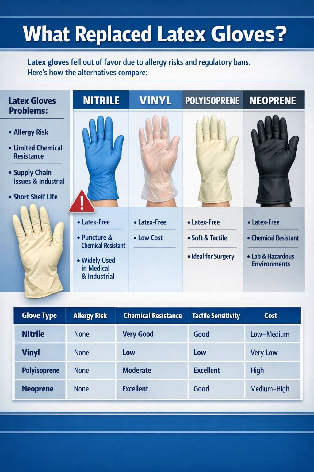 Meskipun demikian, nitril bukanlah satu-satunya pengganti. Sarung tangan vinil, neoprena, poliisoprena, dan polimer hibrid masing-masing menempati posisi tertentu tergantung pada tugas, sensitivitas yang diperlukan, kebutuhan ketahanan terhadap bahan kimia, dan anggaran. Artikel ini membahas semuanya secara mendetail — menjelaskan mengapa peralihan dari lateks terjadi, apa saja alternatif yang ditawarkan, dan bagaimana memilih alternatif yang tepat untuk kasus penggunaan spesifik Anda.